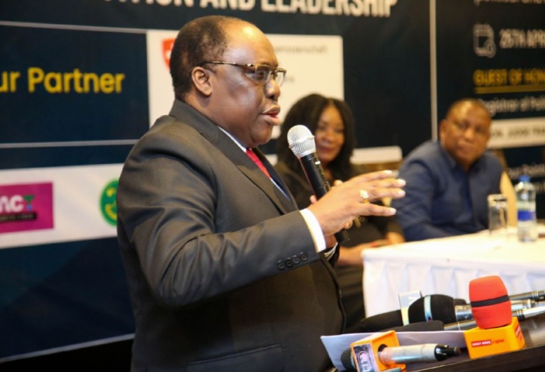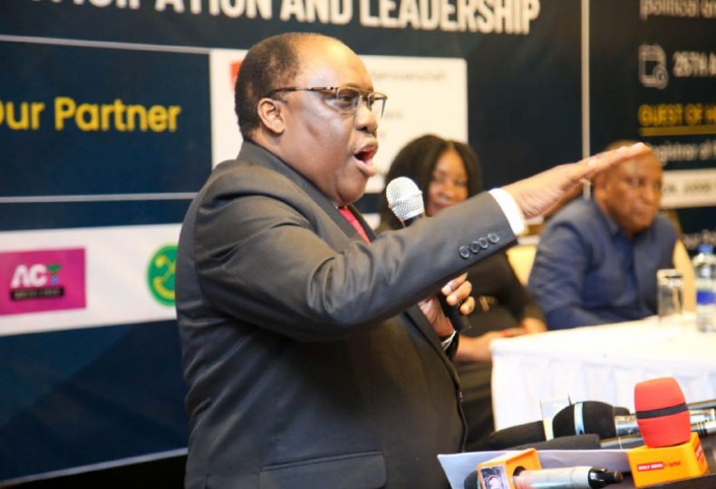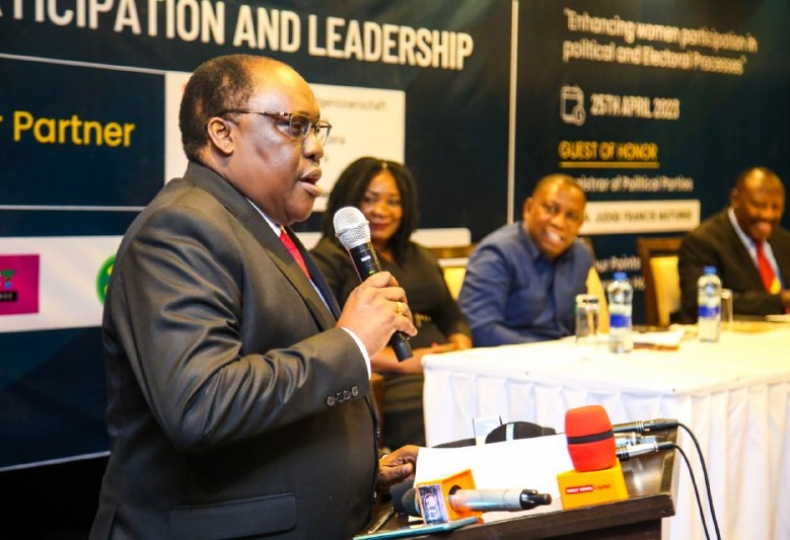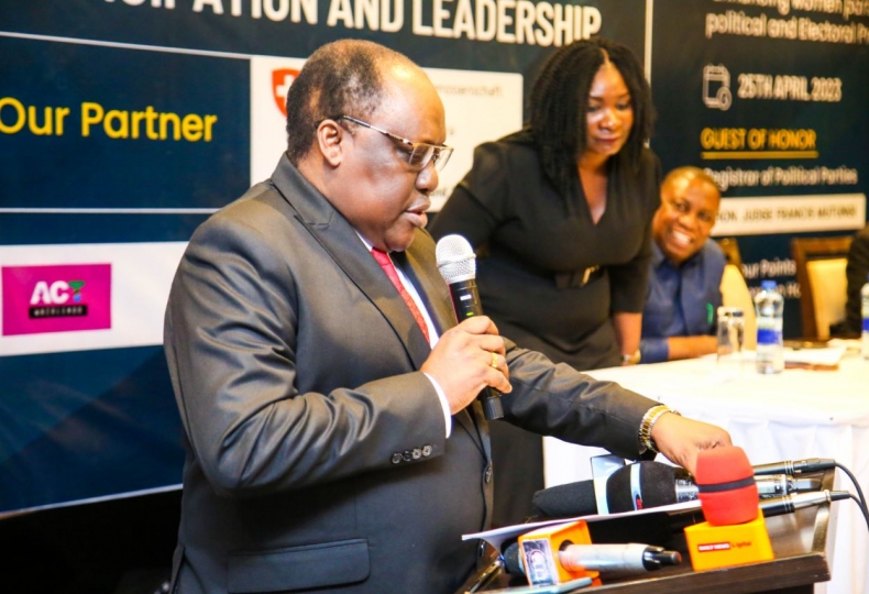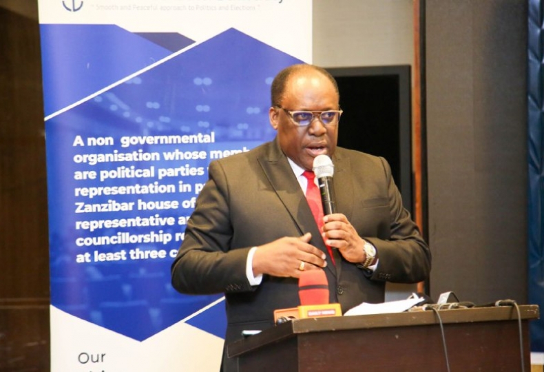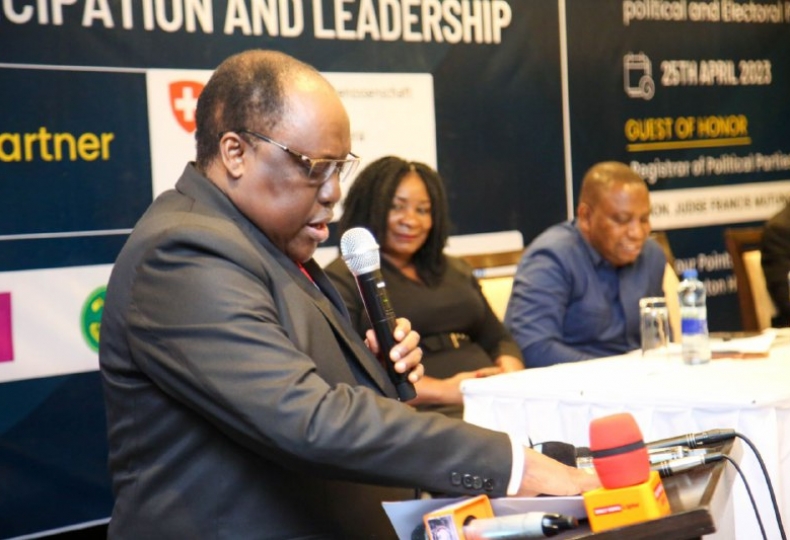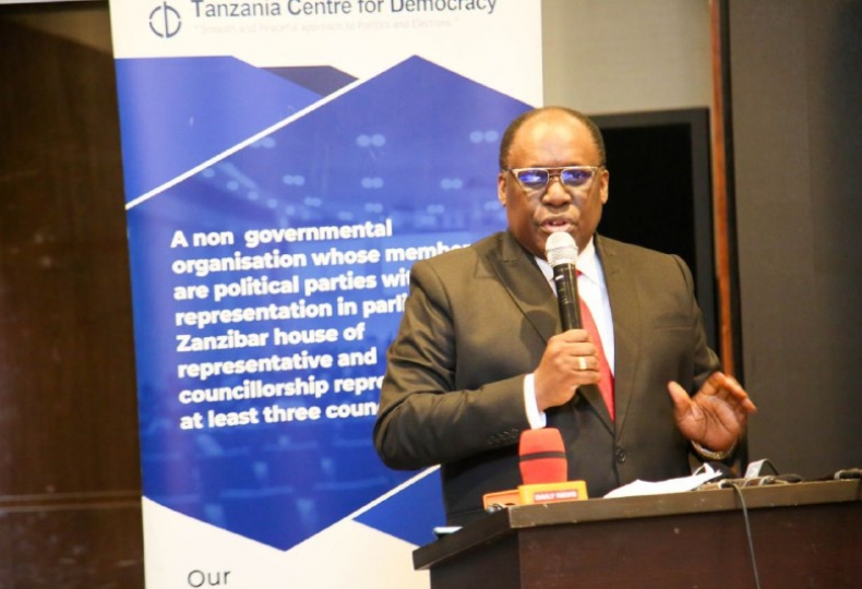 The Registrar of Political Parties, Hon. Judge Francis Mutungi speaking at a workshop to review report on the analysis of gender gaps in the legal documents of political parties organized by Tanzania Center for Democracy (TCD) in collaboration with the Switzerland Embassy in Tanzania at Four Points by Sheraton Hotel in Dar es Salaam on Tuesday 25th April 2023.